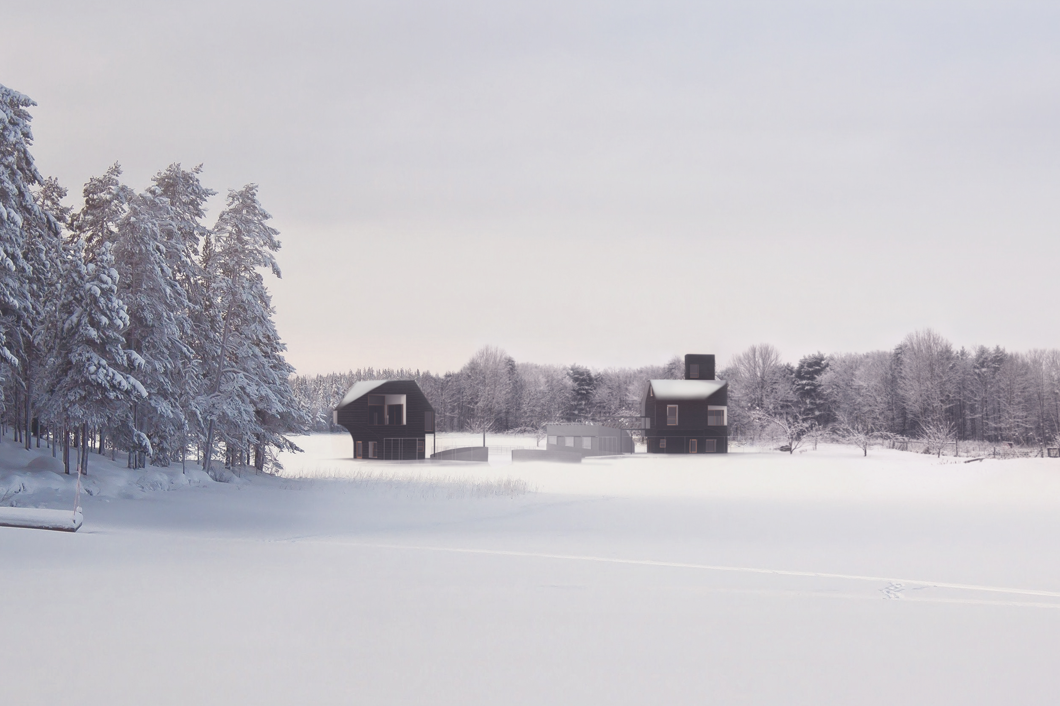 The Farmhouse manipulates familiar farmhouse elements, such as the front porch, chimney, and gambrel roof as a means for shifting expected formal, spatial, and contextual experiences or associations of a farmhouse. The project consists of two houses - a main house and a small guest house - along with a series of integrated barns and landscape elements, fostering animal, vegetal, and human interactions. The black, charred wood siding contrasts the winter white and summer green landscapes, using color contrast to heighten the qualities of the landscape and the architecture.