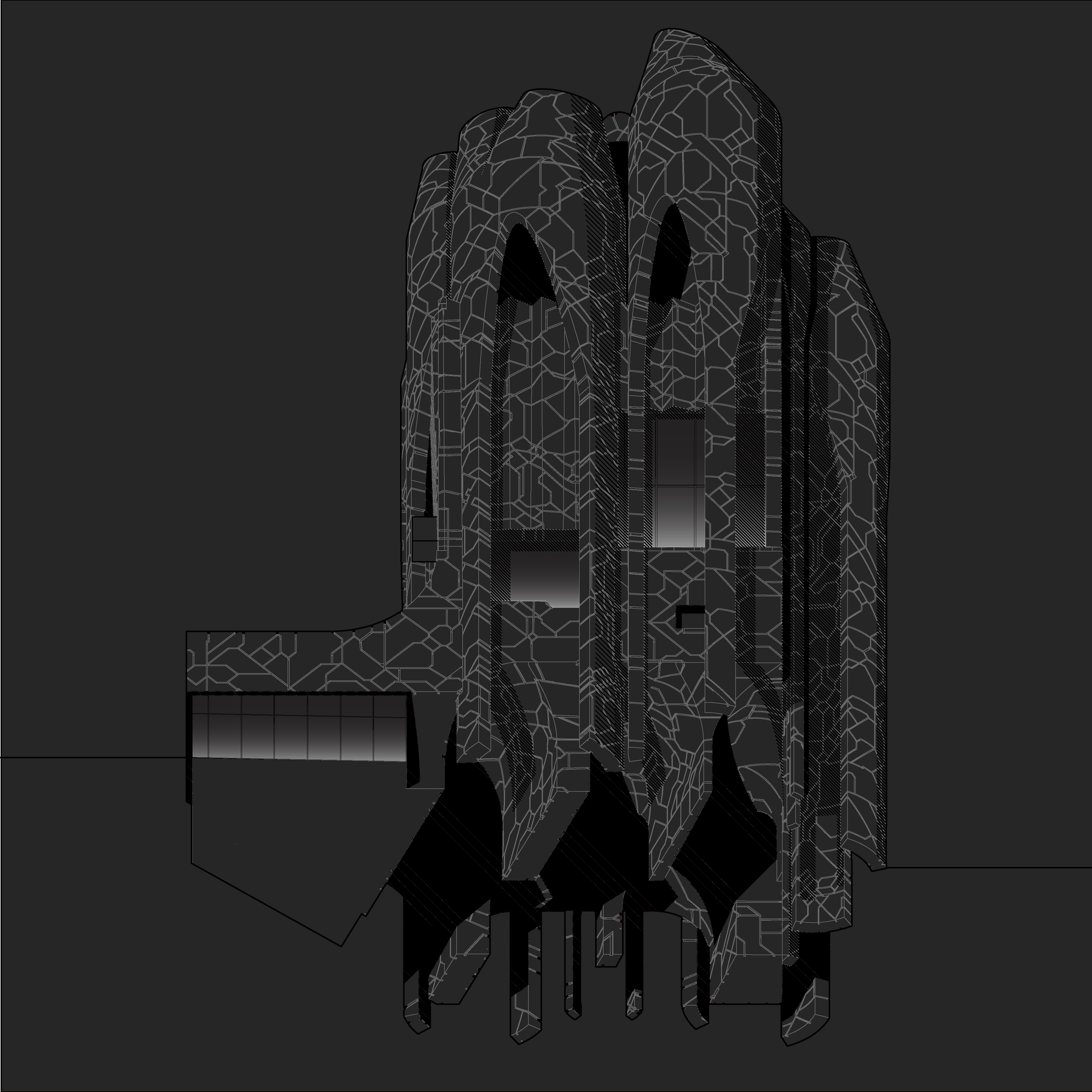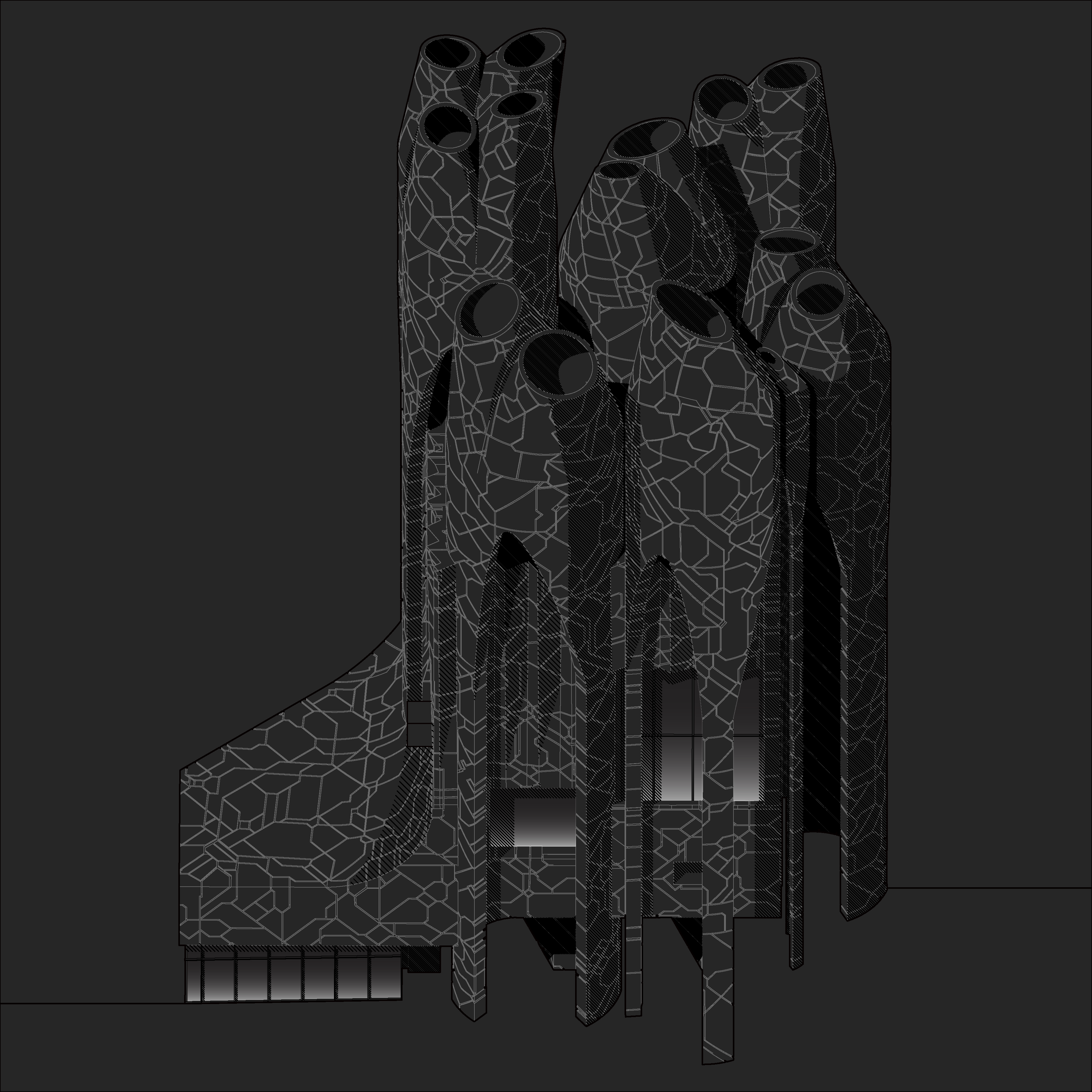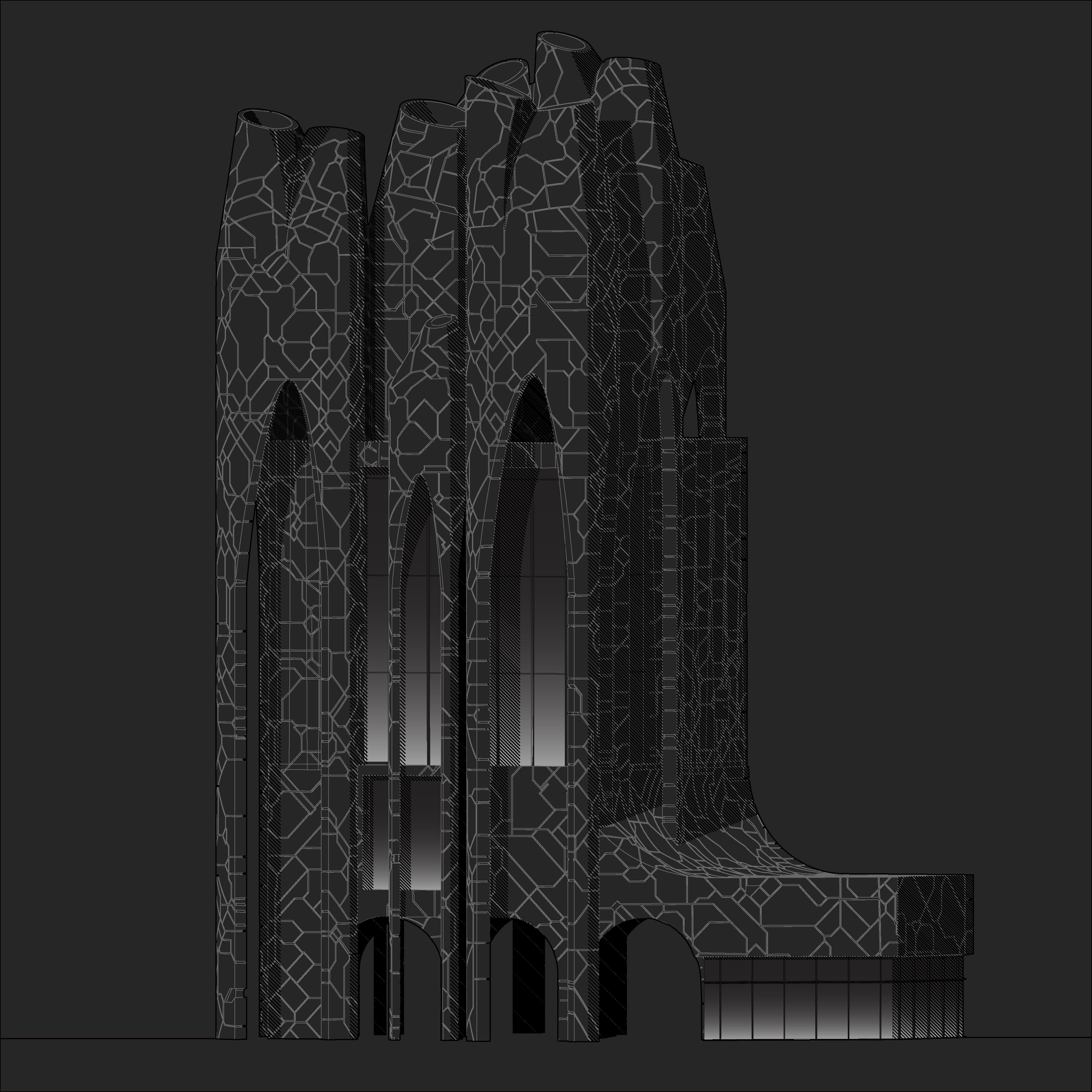 This is a proposal for a music hall located in San Francisco’s Golden Gate Park. Central to it is a vertical orientation, fostering contextual continuity with the surrounding trees while at the ground level a series of intersecting vaults carve away the building to create a continuous ground plane for social gatherings. Nine cylinders with conical tops create a loose, informal colonnade around the music hall, giving an almost Gothic quality to it, which is enhanced by a textured skin that reads as perhaps intricately cut stone or perhaps as weathered & cracked material from long ago.