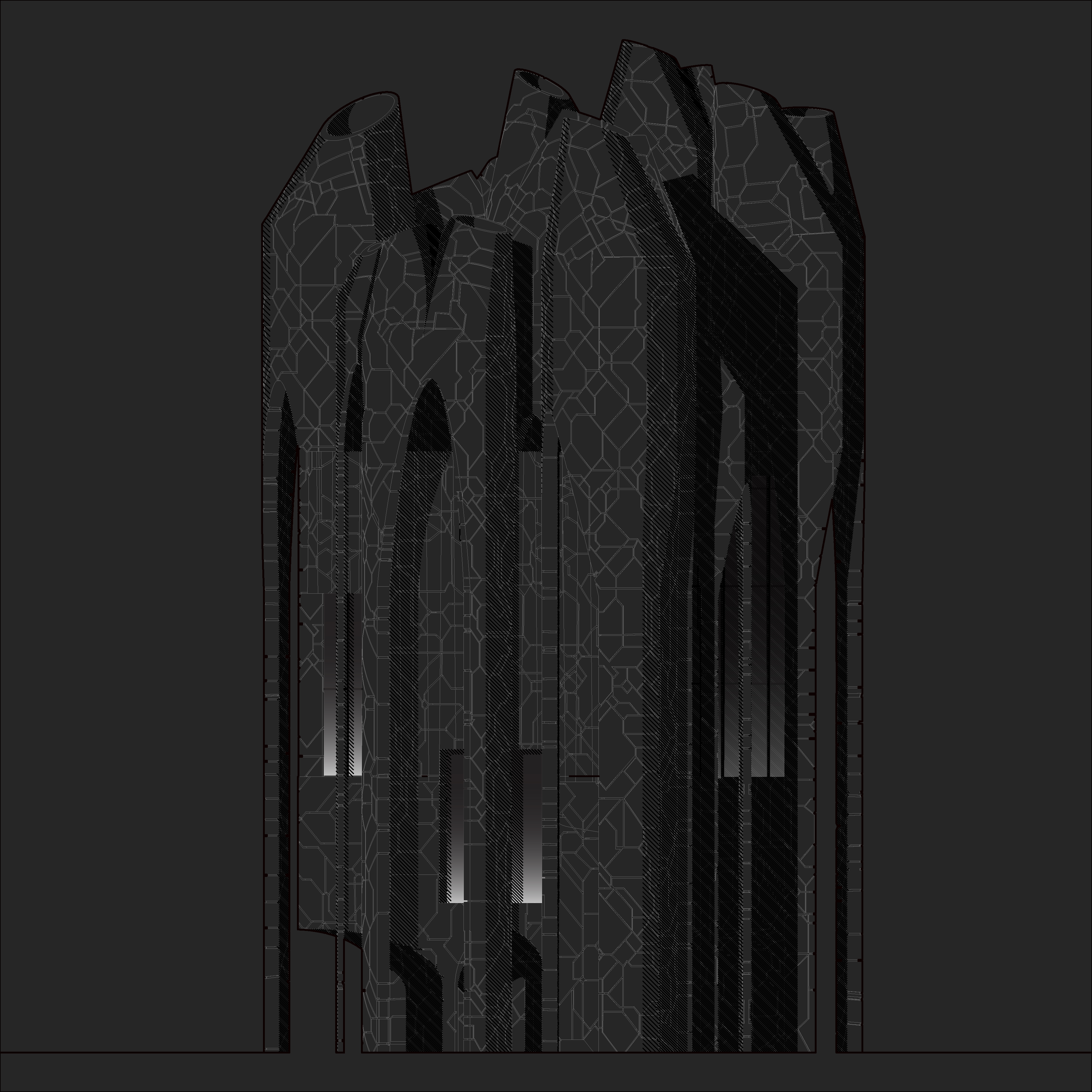 The exterior materiality suggests both a process of architectural becoming and of architectural decay. Geometrically precise, yet appearing weathered to the point of cracking along with the lack of repetition conjour an uneasy reading of time. A subtle gradient from lighter at the bottom to darker at the top assists in perceiving the vertical ascension.